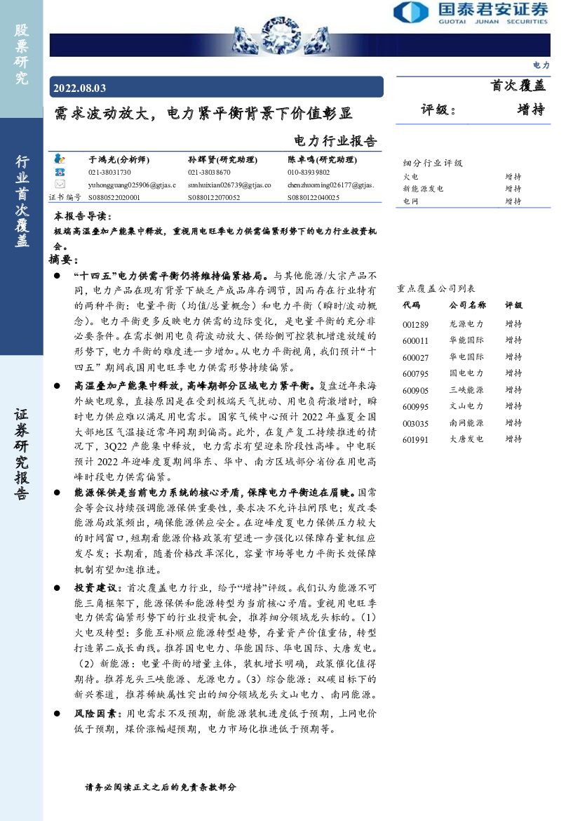 国泰君安:电力行业报告:需求波动放大,电力紧平衡背景下价值彰显.pdf