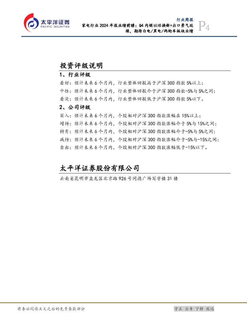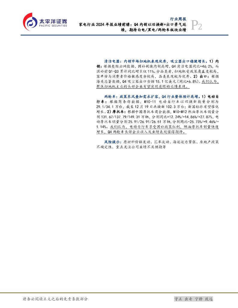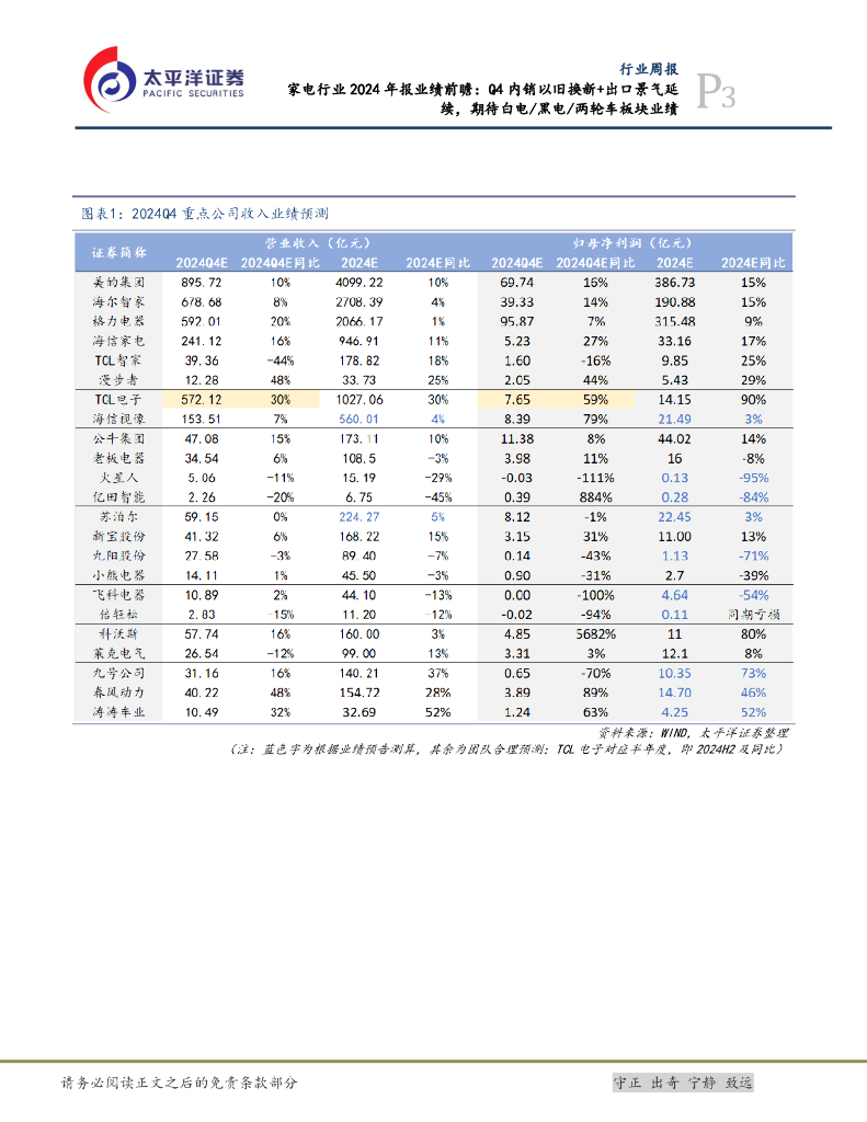 太平洋证券:家电行业2024年报业绩前瞻:Q4内销以旧换新+出口景气延续,期待白电/黑电/两轮车板块业绩.pdf