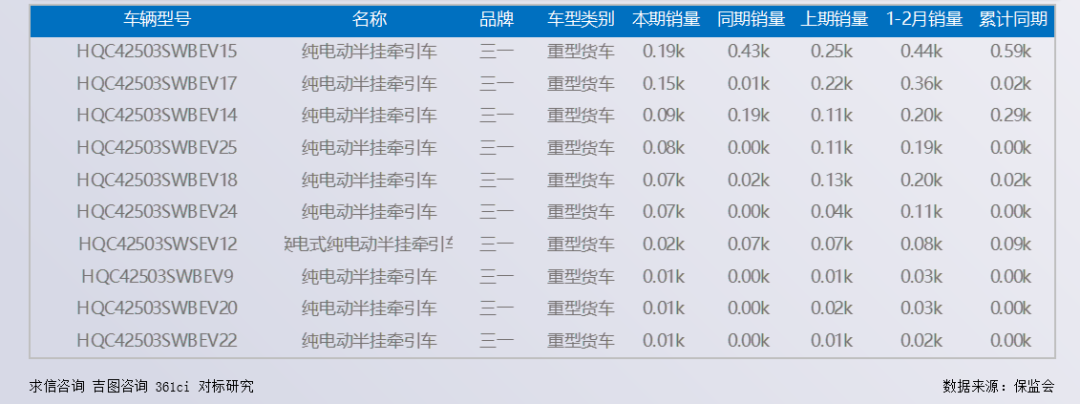 本期最俏车型为三一重型货车HQC42503SWBEV15型纯电动半挂牵引车,销量187辆,占比26.38%,累计销量438辆。三一重型货车HQC42503SWBEV17型纯电动半挂牵引车是另一款销量较高车型,本期销量145辆,占比20.45%,累计销量361辆。