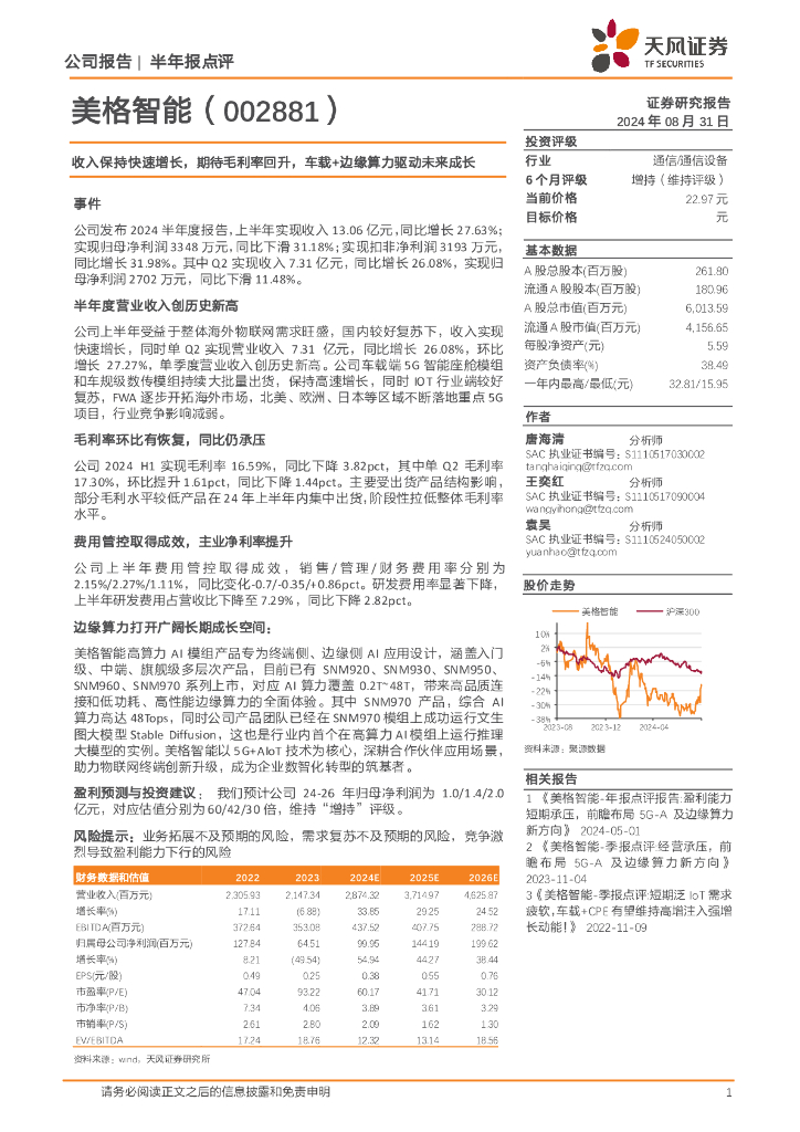 天风证券:美格智能(002881)-收入保持快速增长,期待毛利率回升,车载+边缘算力驱动未来成长.pdf