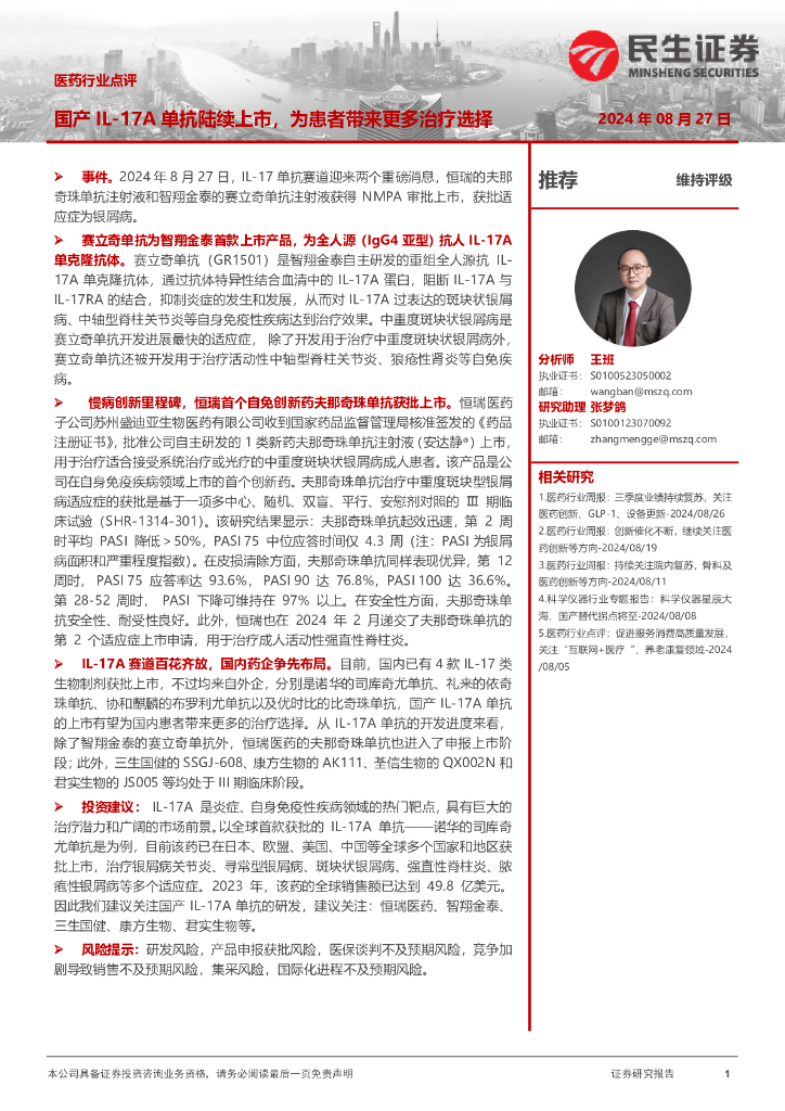 民生证券:医药行业点评:国产IL-17A单抗陆续上市,为患者带来更多治疗选择.pdf