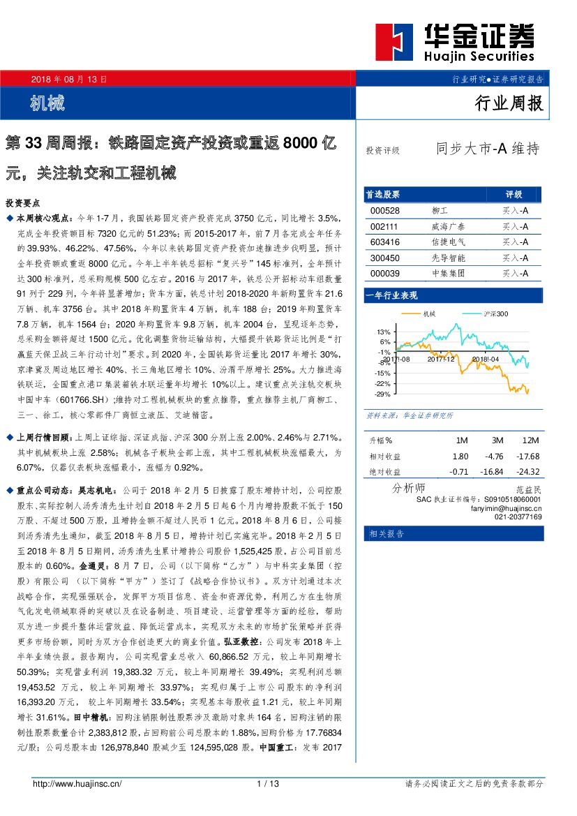 华金证券:机械行业第33周周报:铁路固定资产投资或重返8000亿元,关注轨交和工程机械.pdf
