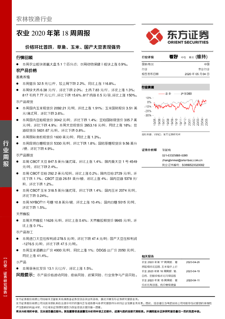 东方证券:农业2020年第18周周报:价格环比普跌,草鱼、玉米、国产大豆表现强势.pdf