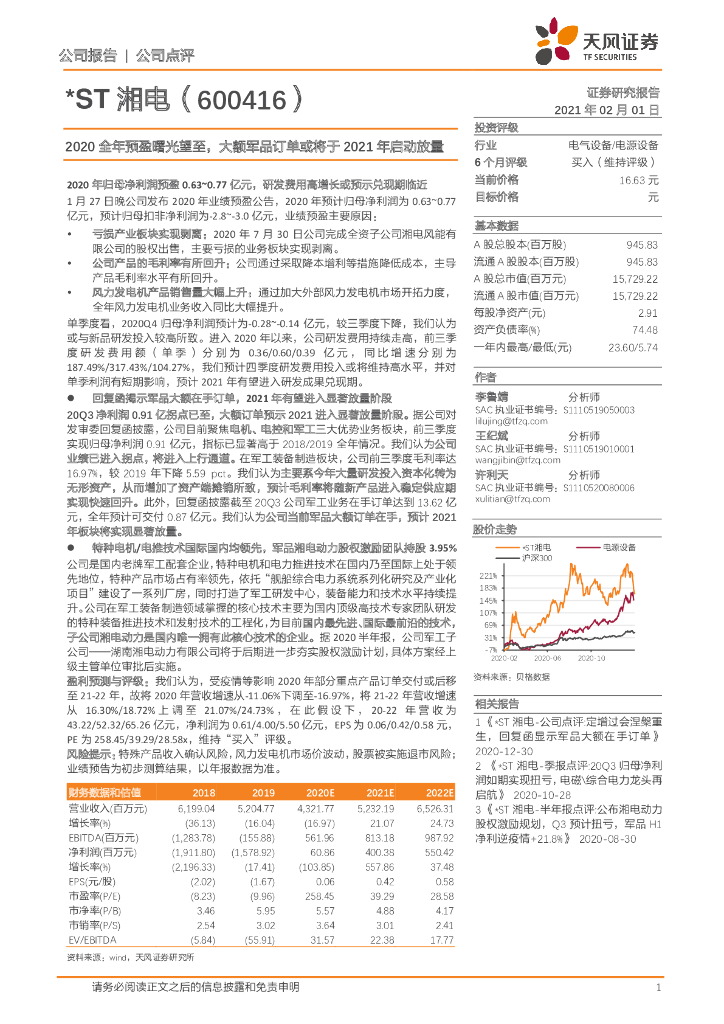 天风证券:*ST湘电(600416)-2020全年预盈曙光望至,大额军品订单或将于2021年启动放量.pdf