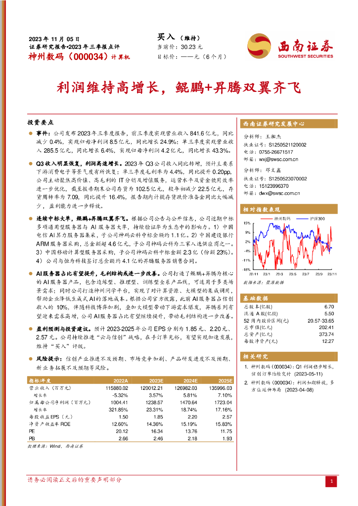 西南证券:神州数码(000034)-2023年三季报点评:利润维持高增长,鲲鹏+昇腾双翼齐飞.pdf