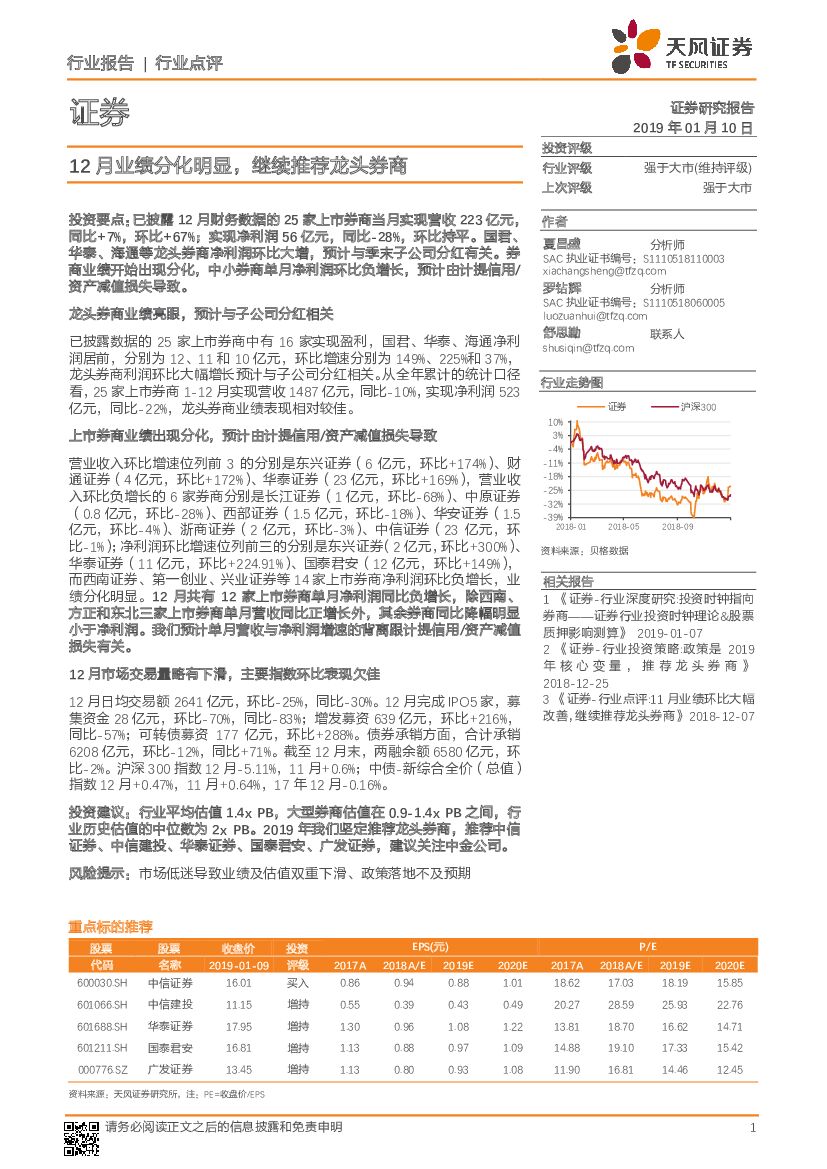 天风证券:证券行业点评:12月业绩分化明显,继续推荐龙头券商.pdf