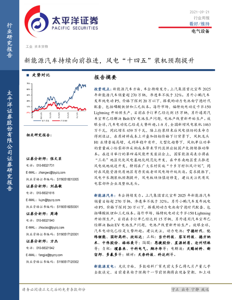 太平洋证券:电气设备行业周报:新能源汽车持续向前推进,风电“十四五”装机预期提升.pdf