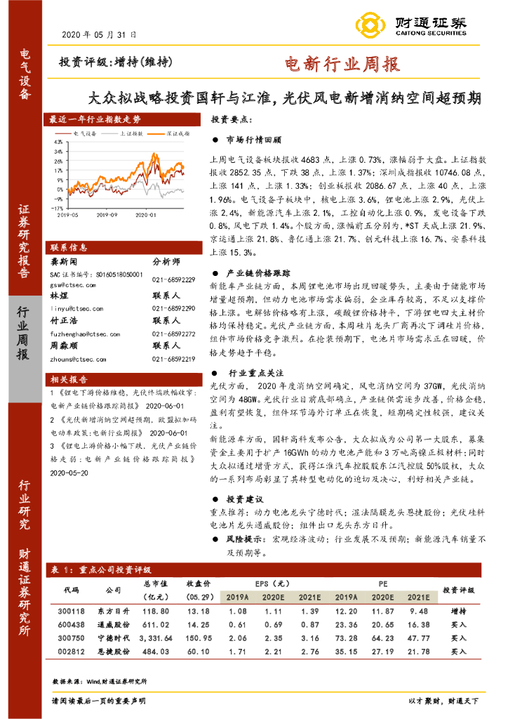 财通证券:电新行业周报:大众拟战略投资国轩与江淮,光伏风电新增消纳空间超预期.pdf