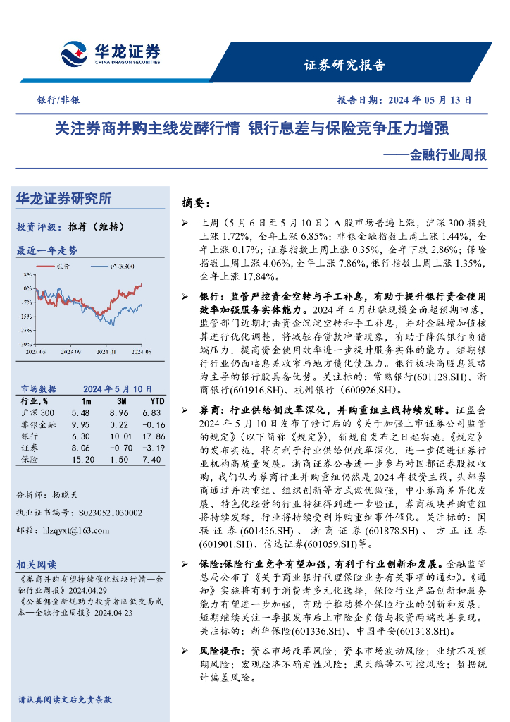 华龙证券:金融行业周报:关注券商并购主线发酵行情银行息差与保险竞争压力增强.pdf