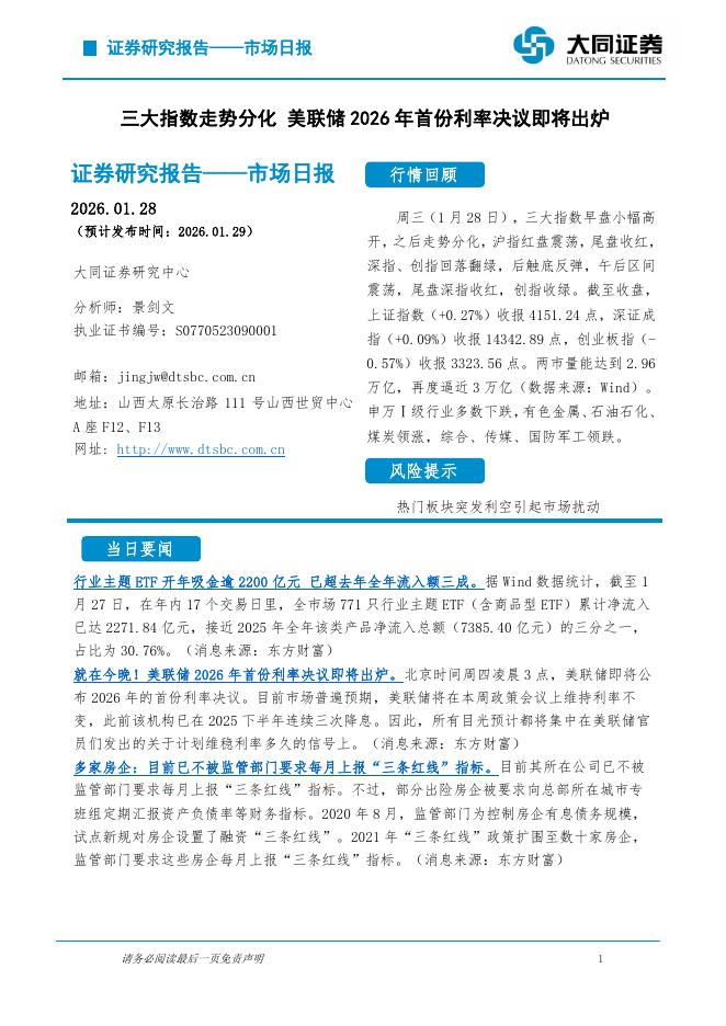 大同证券:市场日报:三大指数走势分化美联储2026年首份利率决议即将出炉-260130.pdf