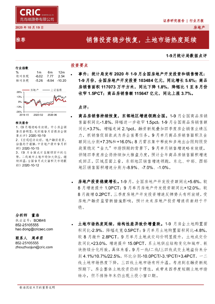 克而瑞证券:房地产行业1-9月统计局数据点评:销售投资稳步恢复,土地市场热度延续.pdf