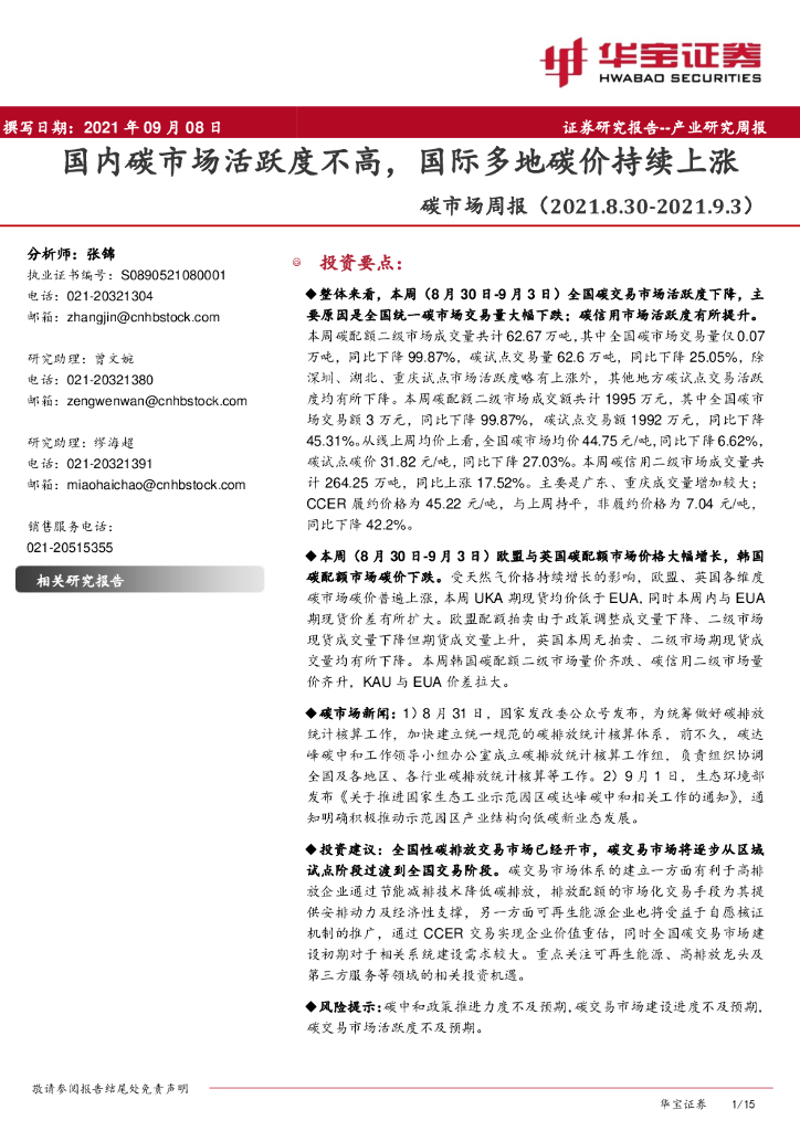 华宝证券:碳市场周报:国内碳市场活跃度不高,国际多地碳价持续上涨.pdf