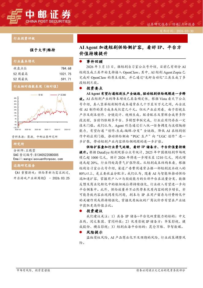 中邮证券:传媒:AIAgent加速短剧供给侧扩容,看好IP、平台方价值持续提升.pdf