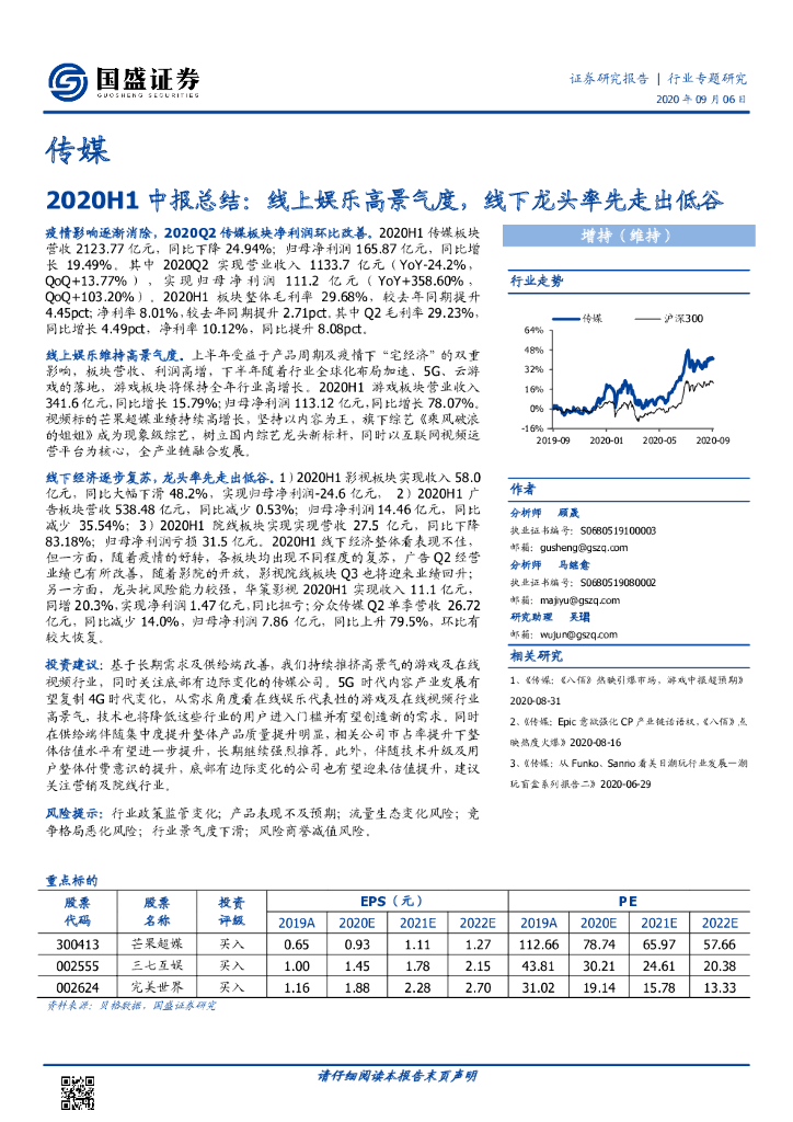 国盛证券:传媒行业2020H1中报总结:线上娱乐高景气度,线下龙头率先走出低谷.pdf