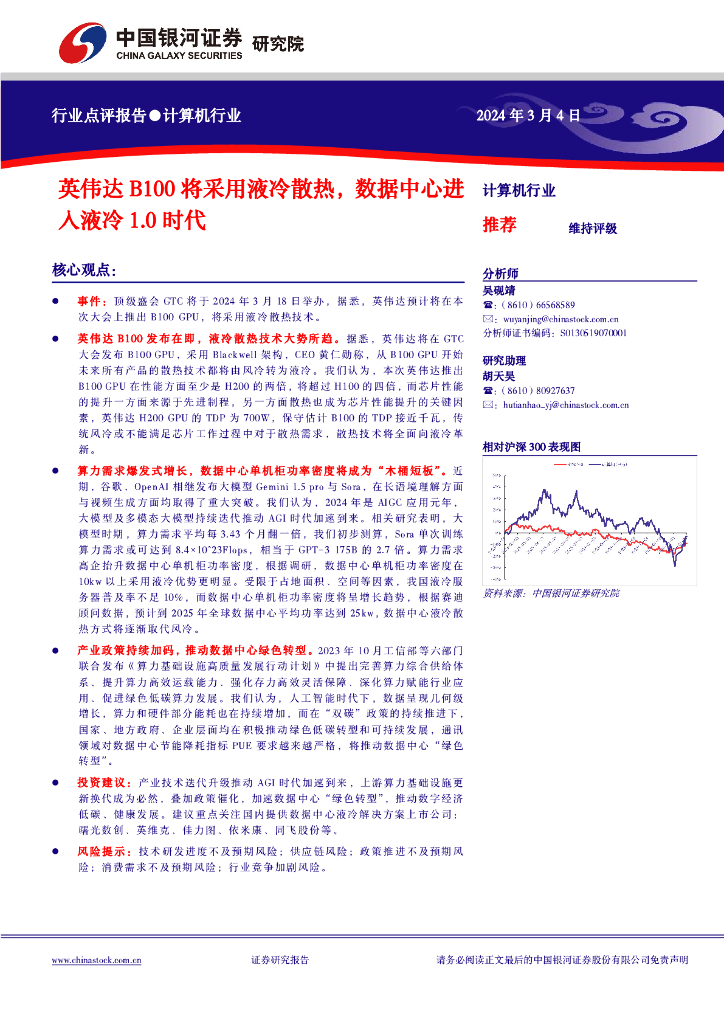 中国银河:计算机行业:英伟达B100将采用液冷散热,数据中心进入液冷1.0时代.pdf