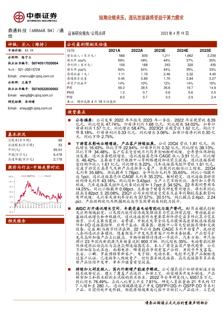 中泰证券:鼎通科技(688668)-短期业绩承压,通讯连接器将受益于算力需求.pdf