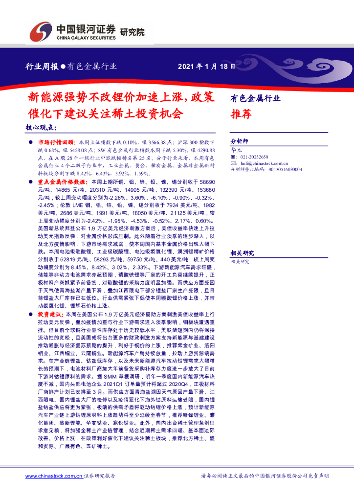 中国银河:有色金属行业周报:新能源强势不改锂价加速上涨,政策催化下建议关注稀土投资机会.pdf