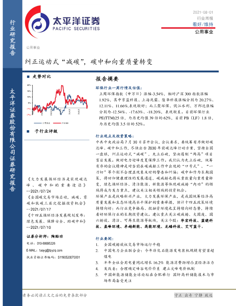 太平洋证券:公用事业行业周报:纠正运动式“减碳”,碳中和向重质量转变.pdf