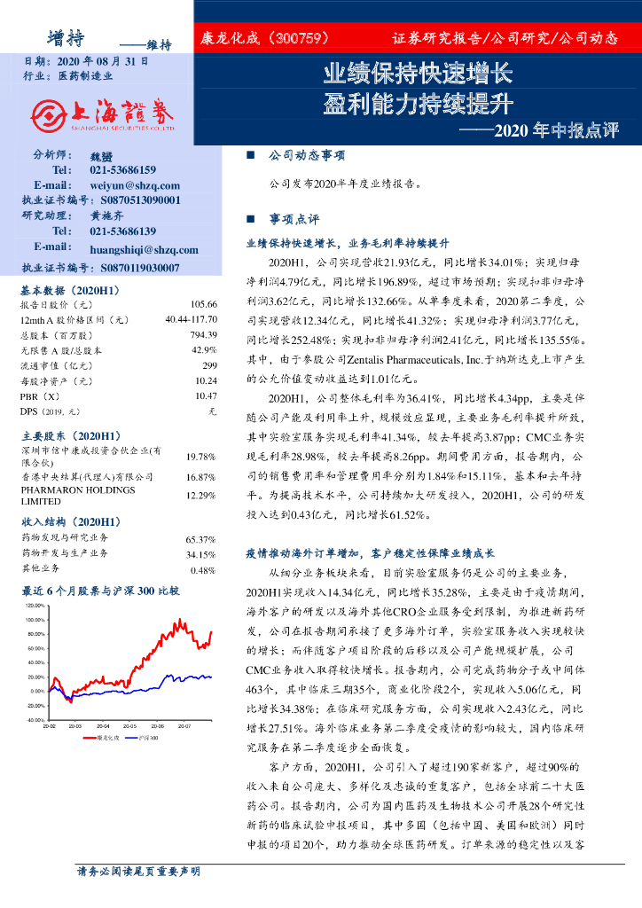上海证券:康龙化成(300759)-2020年中报点评:业绩保持快速增长 盈利能力持续提升.pdf