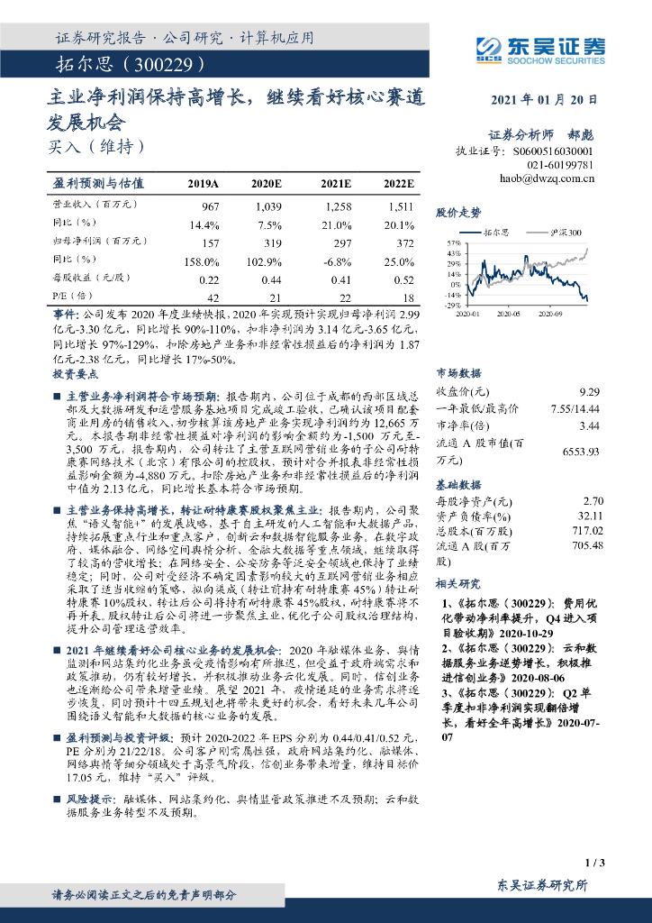 东吴证券:拓尔思(300229)-主业净利润保持高增长,继续看好核心赛道发展机会.pdf