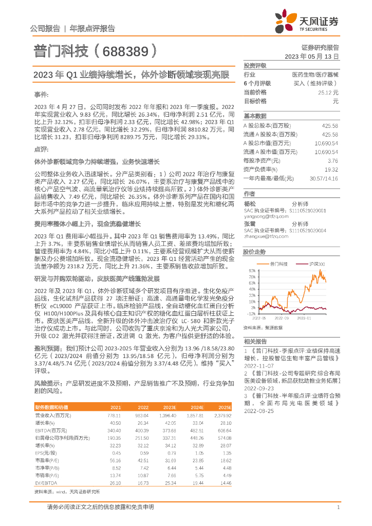天风证券:普门科技(688389)-2023年Q1业绩持续增长,体外诊断领域表现亮眼.pdf
