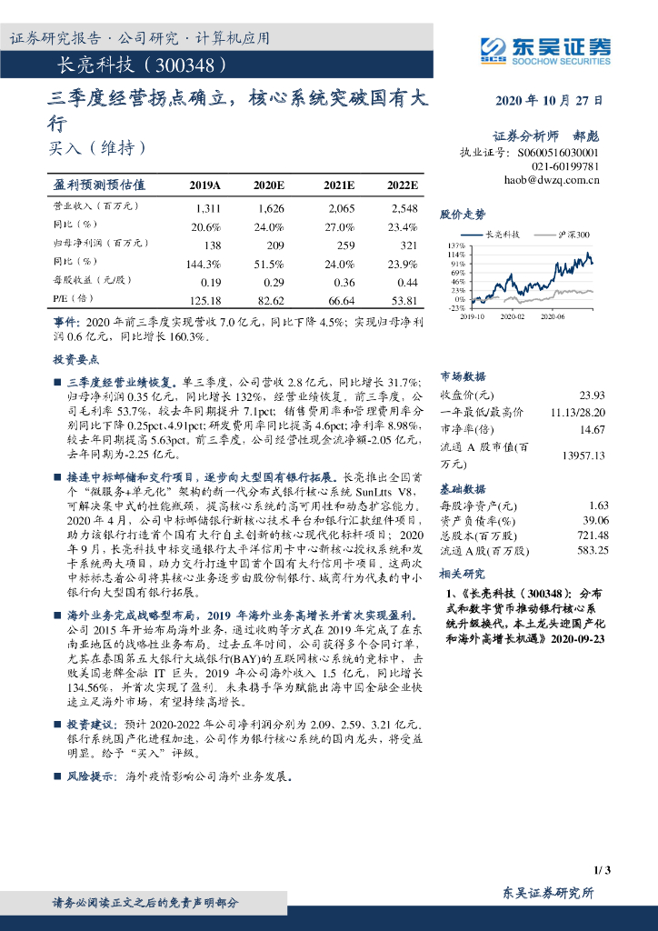 东吴证券:长亮科技(300348)-三季度经营拐点确立,核心系统突破国有大行.pdf