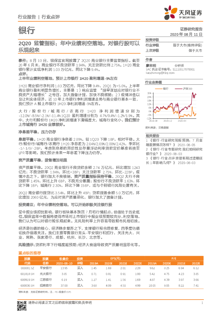 天风证券:银行行业点评:2Q20监管指标:年中业绩利空落地,对银行股可以乐观起来.pdf