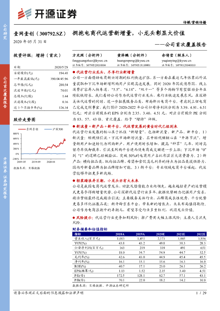 开源证券:壹网壹创(300792)-公司首次覆盖报告:拥抱电商代运营新增量,小龙头彰显大价值.pdf