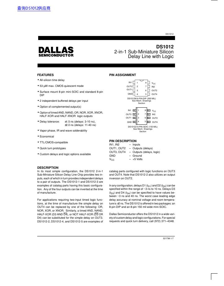 DALLAS DS1012 2-in-1 Sub-Miniature Silicon Delay Line with Logic 技术手册.pdf