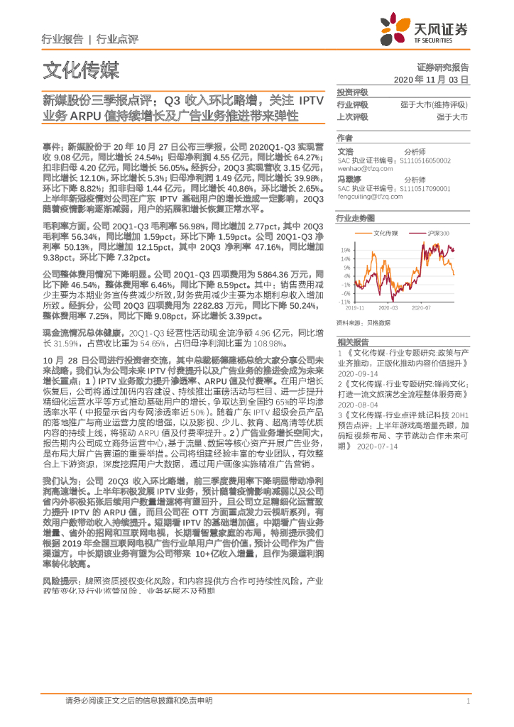 天风证券:文化传媒行业点评:新媒股份三季报点评:Q3收入环比略增,关注IPTV业务ARPU值持续增长及广告业务推进带来弹性.pdf