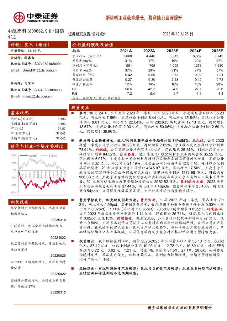中泰证券:中航高科(600862)-新材料主业稳步增长,盈利能力显著提升.pdf