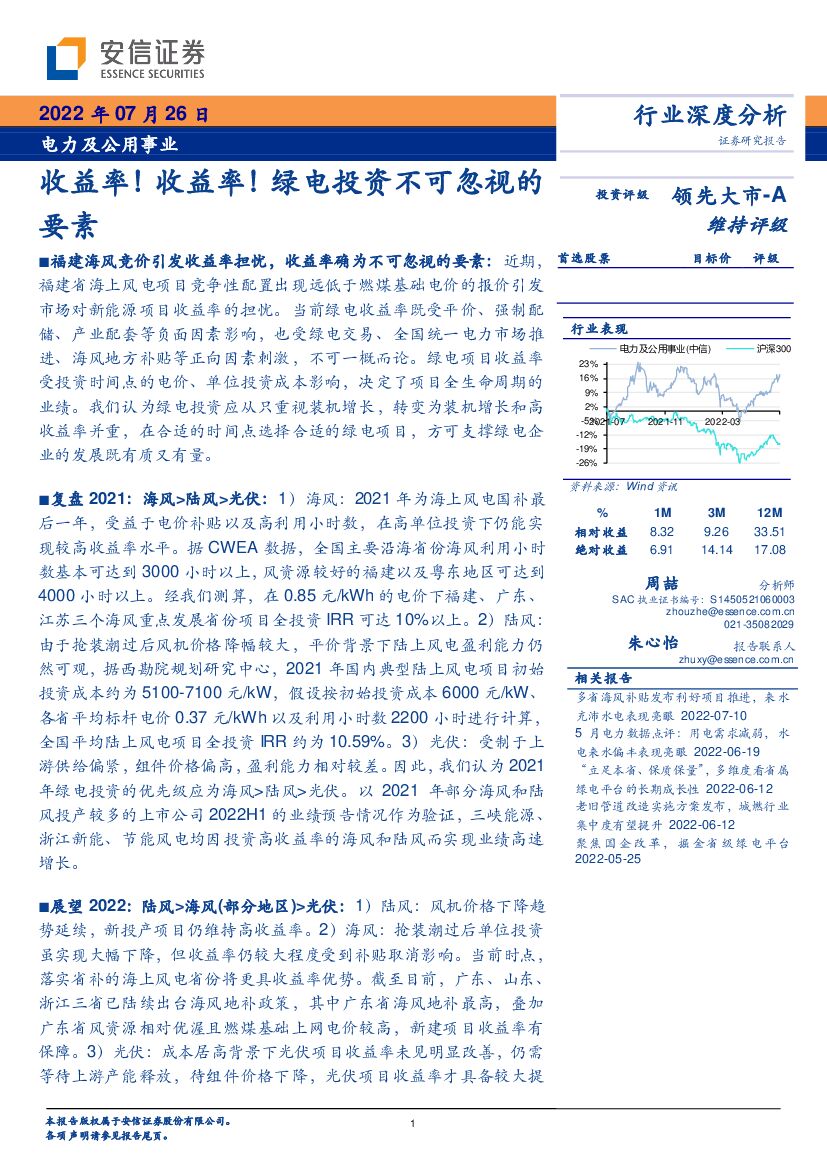 安信证券:电力及公用事业行业深度分析:收益率!收益率!绿电投资不可忽视的要素.pdf