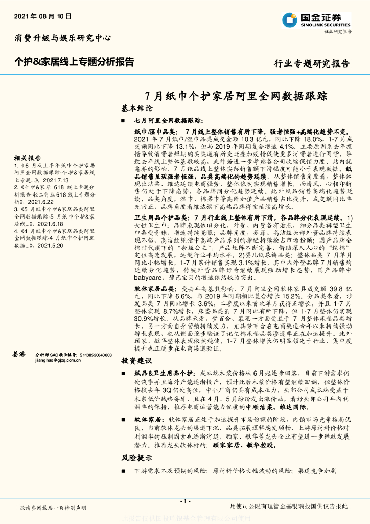 国金证券:个护&家居线上专题分析报告:7月纸巾个护家居阿里全网数据跟踪.pdf