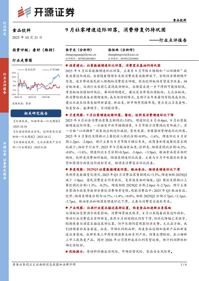 开源证券:食品饮料行业点评报告:9月社零增速边际回落,消费修复仍待巩固.pdf
