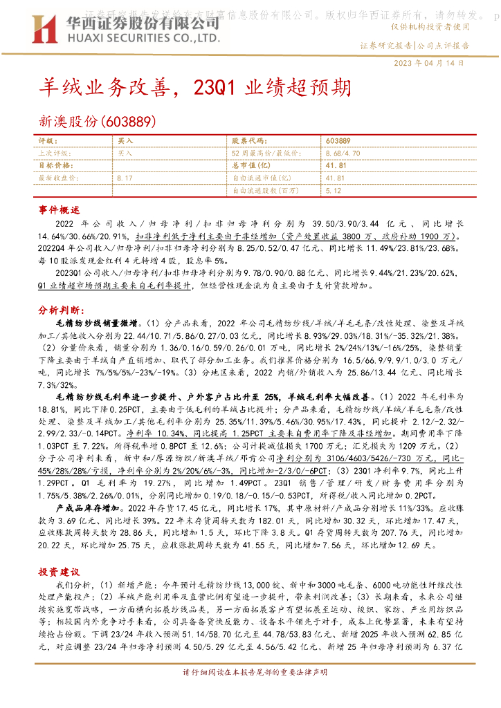 华西证券:新澳股份(603889)-羊绒业务改善,23Q1业绩超预期.pdf