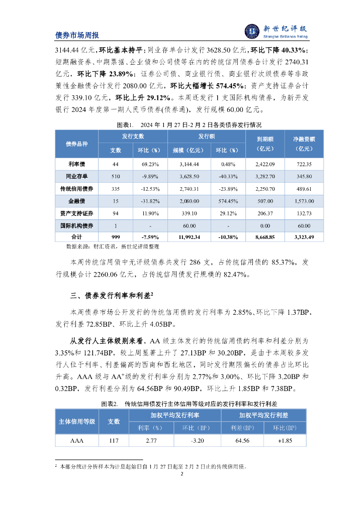 新世纪评级:金融债发行规模环比大幅增长 债券发行利率继续下探——债券市场周报(2024/1/27-2/2).pdf