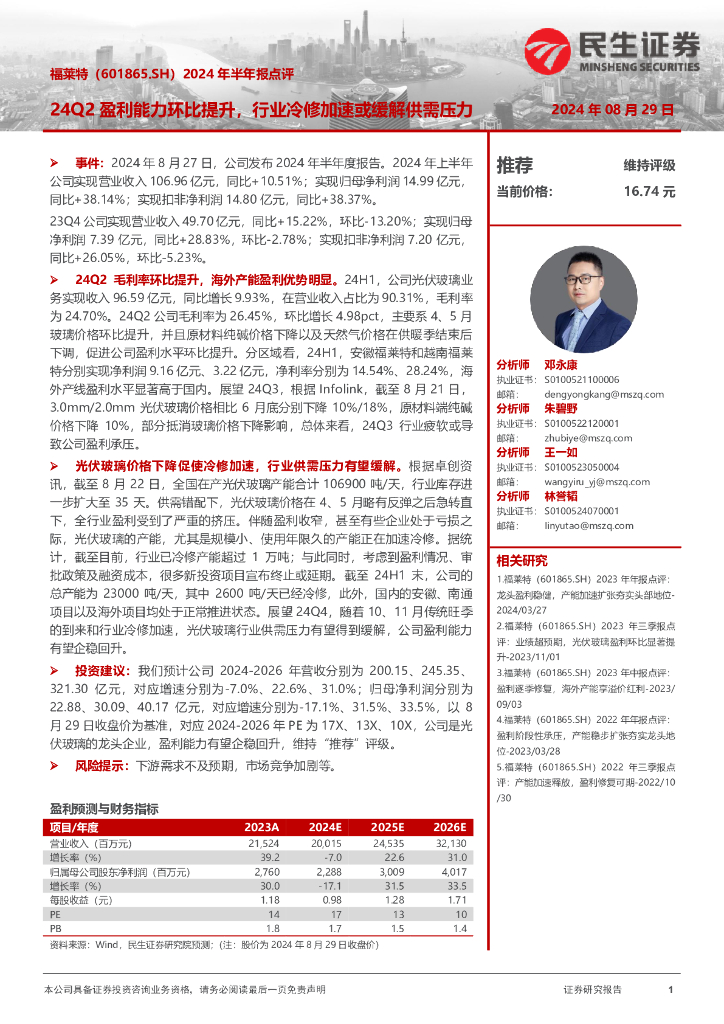 民生证券:福莱特(601865)-2024年半年报点评:24Q2盈利能力环比提升,行业冷修加速或缓解供需压力.pdf
