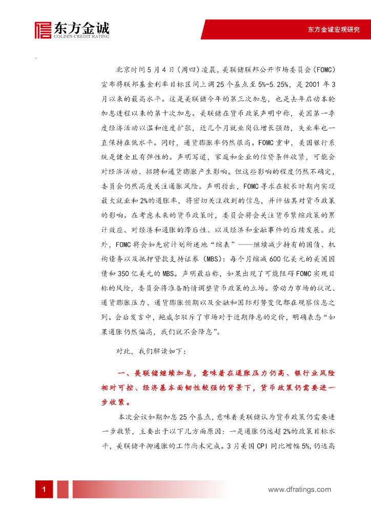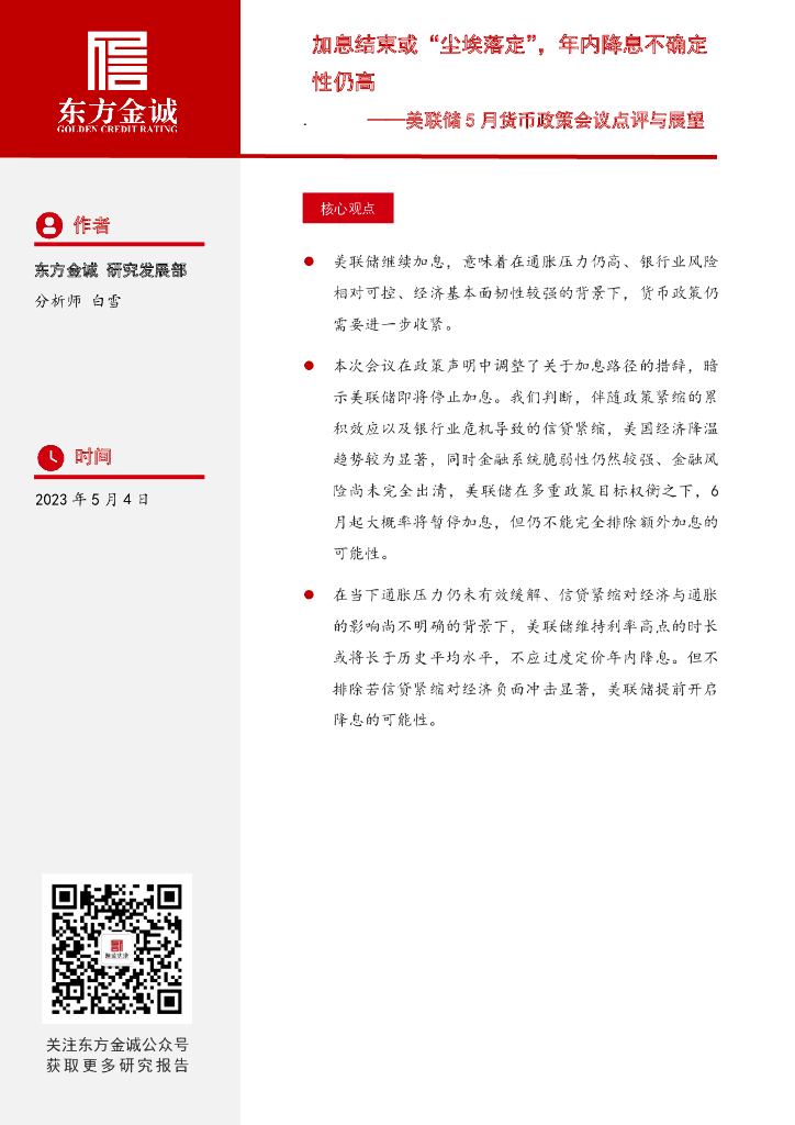 东方金诚:加息结束或“尘埃落定”,年内降息不确定性仍高-美联储5月货币政策会议点评.pdf