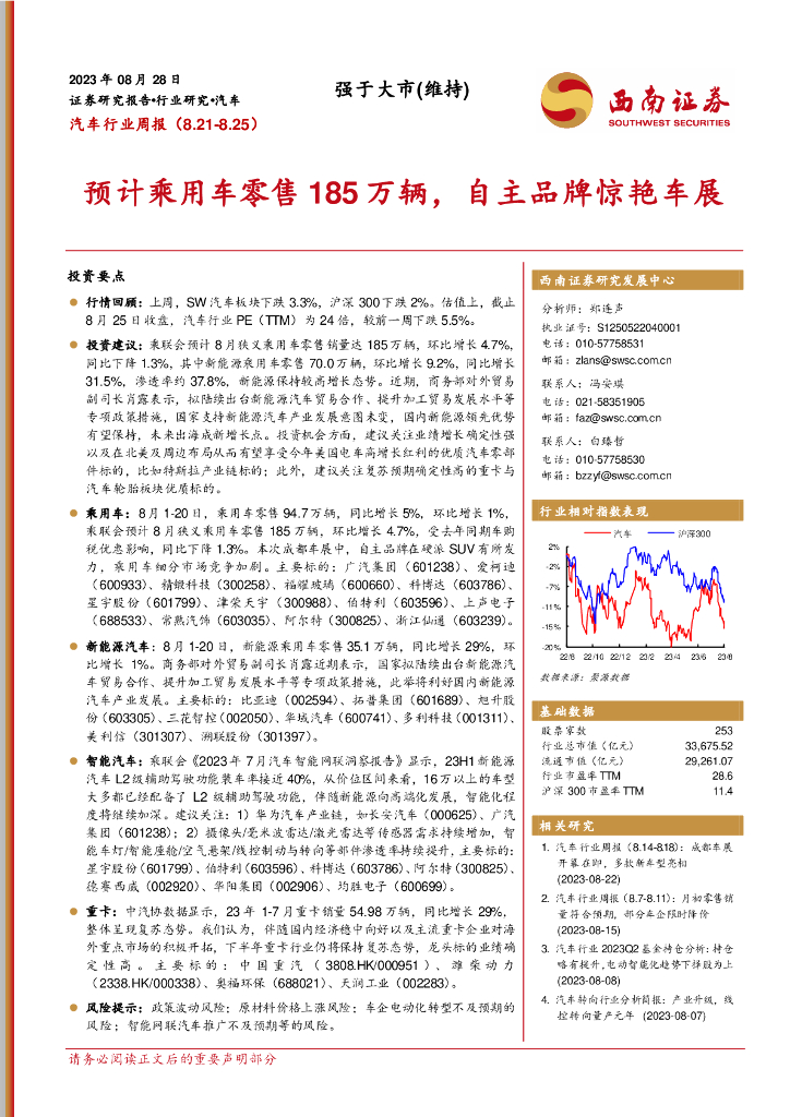 西南证券:汽车行业周报:预计乘用车零售185万辆,自主品牌惊艳车展.pdf