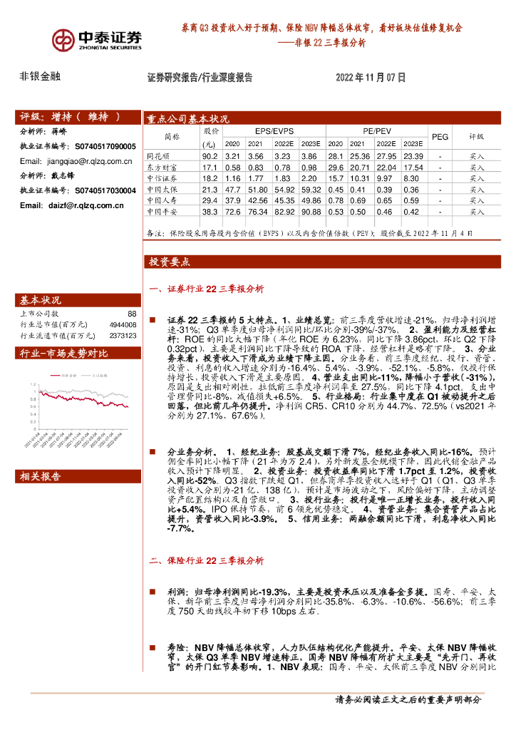 中泰证券:非银22三季报分析:券商Q3投资收入好于预期、保险NBV降幅总体收窄,看好板块估值修复机会.pdf