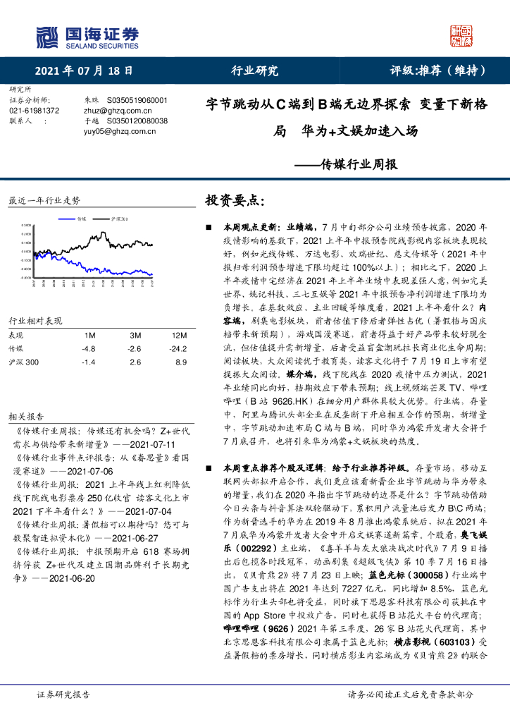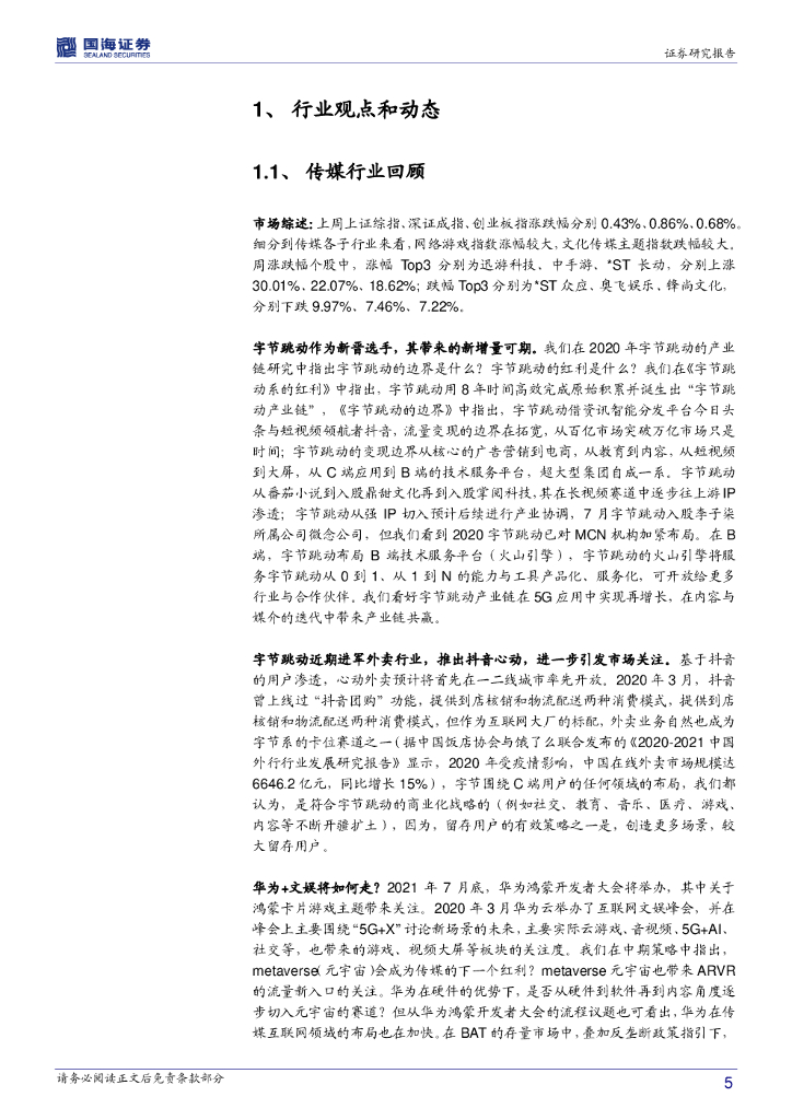 国海证券:传媒行业周报:字节跳动从C端到B端无边界探索 变量下新格局 华为+文娱加速入场.pdf