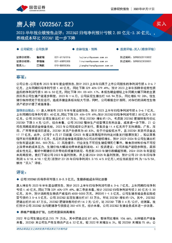 国信证券:唐人神(002567)-2023半年报业绩预告点评:2023Q2归母净利预计亏损2.80亿元-3.30亿元,养殖成本环比2023Q1进一步下降.pdf
