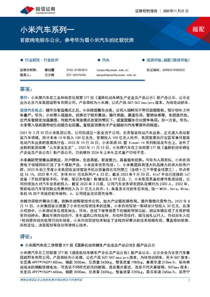 国信证券:小米汽车系列一:首款纯电轿车公示,参考华为看小米汽车的比较优势.pdf