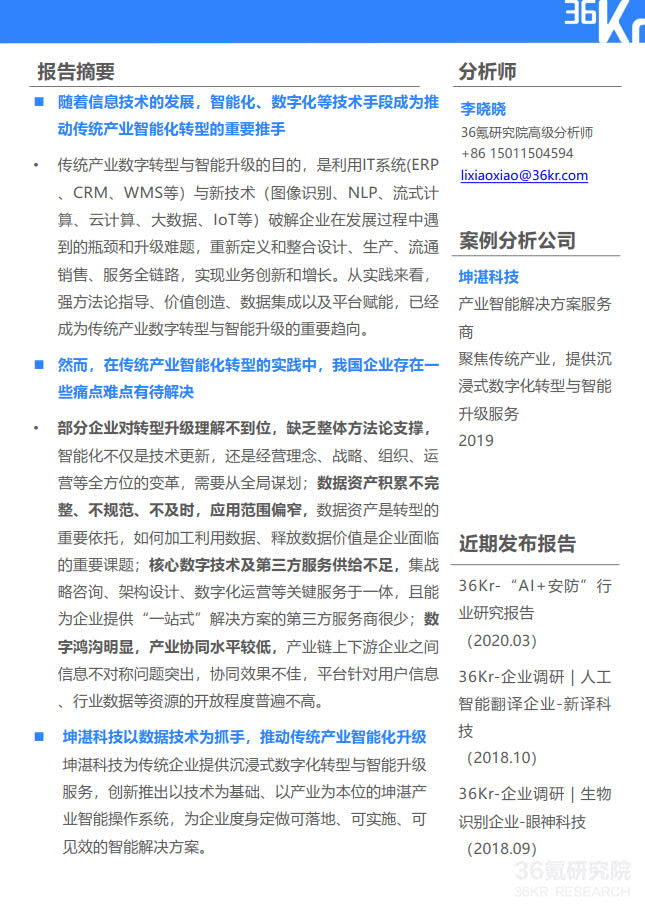 36氪研究院:坤湛科技企业调研报告——为传统行业提供从战略规划到技术实施的全方位智能化解决方案.pdf