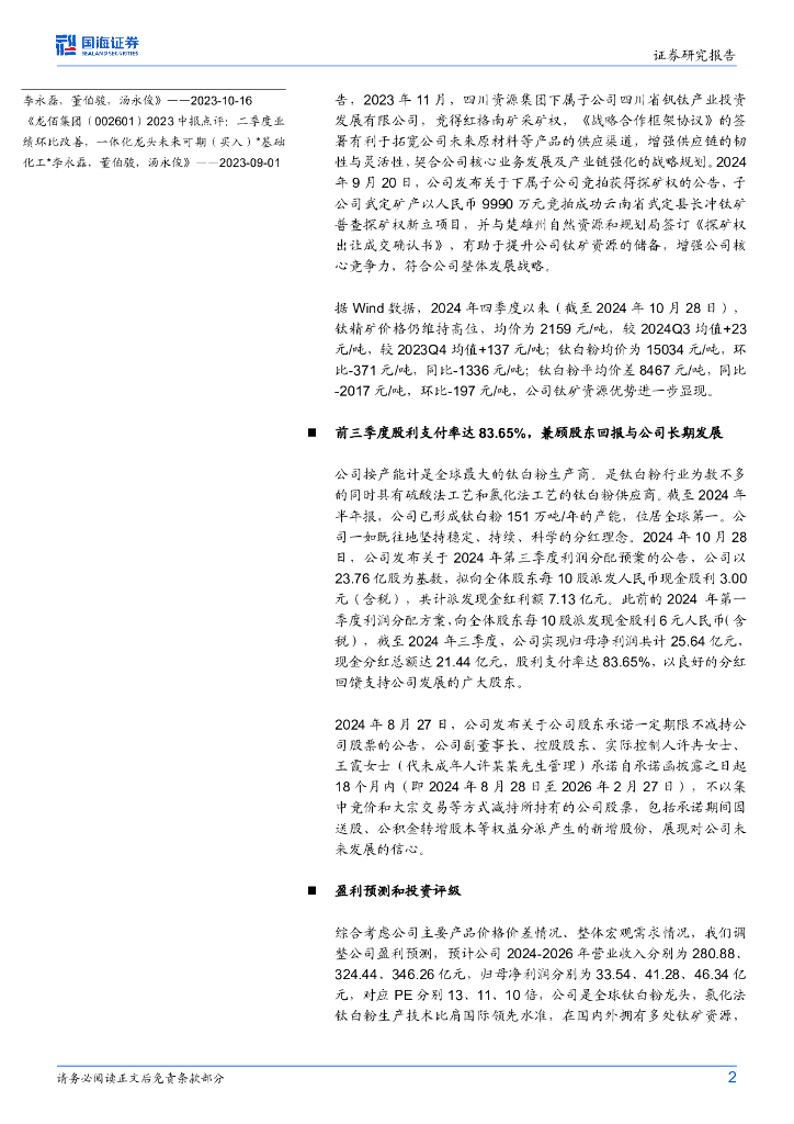 国海证券:龙佰集团(002601)-2024年三季报点评:持续推进钛矿资源储备,前三季度股利支付率达83.65%.pdf