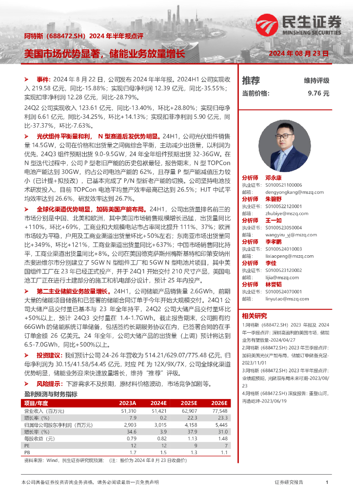 民生证券:阿特斯(688472)-2024年半年报点评:美国市场优势显著,储能业务放量增长.pdf
