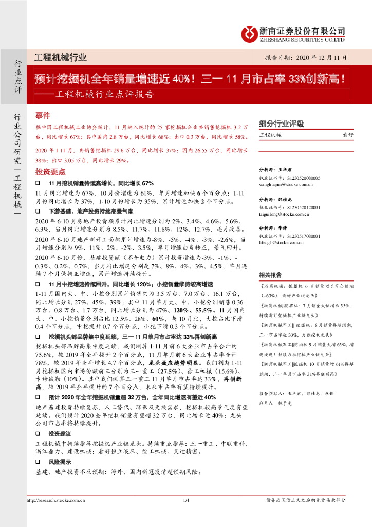 浙商证券:工程机械行业点评报告:预计挖掘机全年销量增速近40%!三一11月市占率33%创新高!.pdf