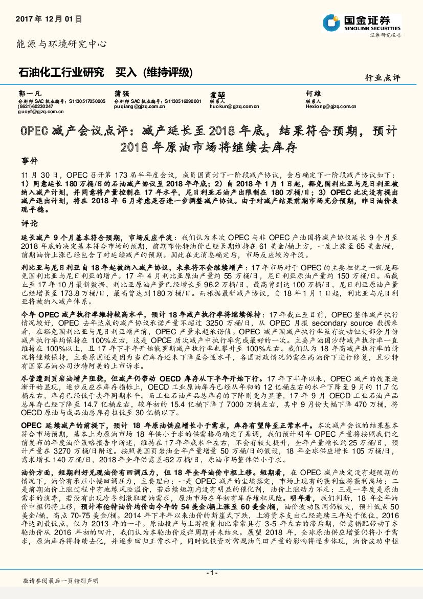 国金证券:石油化工行业研究:OPEC减产会议点评:减产延长至2018年底,结果符合预期,预计2018年原油市场将继续去库存.pdf
