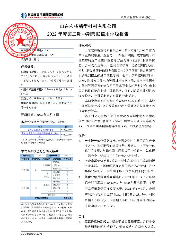 联合资信:山东宏桥新型材料有限公司2022年度第二期中期票据信用评级报告.pdf