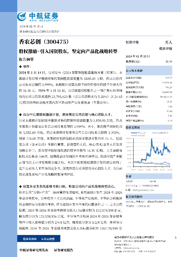 中航证券:香农芯创(300475)-股权激励+引入国资股东,坚定向产品化战略转型.pdf